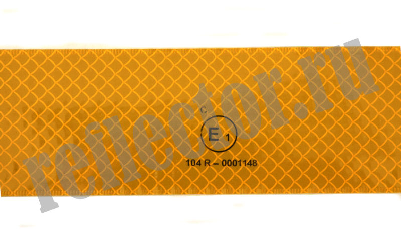 На светоотражающий маркировочный материал с интервалом не менее 500 мм должен быть нанесен международный знак утверждения типа и товарный знак изготовителя ленты. Пример знака (взят из Правил ЕЭК ООН №104) приведен ниже. Символ E в круге указывает на Правила ЕЭК ООН, индекс рядом – код страны, где проходило утверждение (1- Германия), буква С – что это материал класса С согласно Правил ЕЭК ООН №104, а обозначение 104R-0001148 указывает на номер правил и номер сообщения об официальном утверждения типа 1148, выданном в стране.